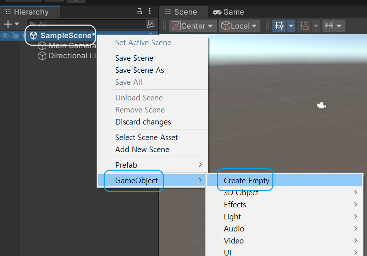 Hierarchy (하이어라키) 창에서 SampleScene 을 마우스 우클릭 - GameObject - Create Empty 를 클릭,