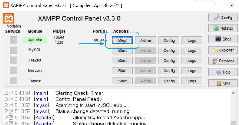 지난 게시글에서 서버를 중지하지 않았다면 아래 부분은 진행 안하셔도 상관 없습니다.