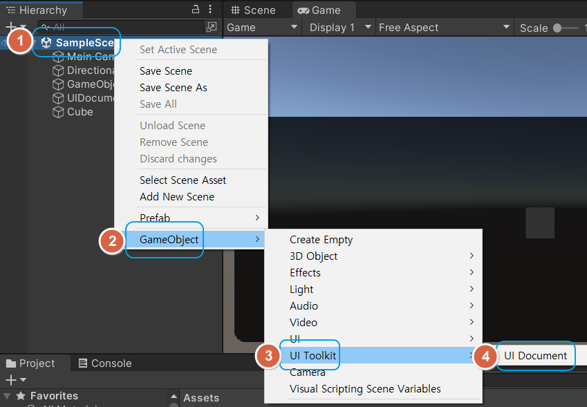 첫번째, Hierarchy ( 하이라키 ) 창에서 씬을 마우스 우클릭 - GameObject - UI Toolkit - UI Document 를 선택,