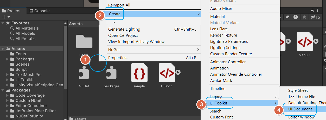 두번째, Assets 파일목록 빈 공간을 마우스 우클릭 - Create - UI Toolkit - UI Document 를 선택하여