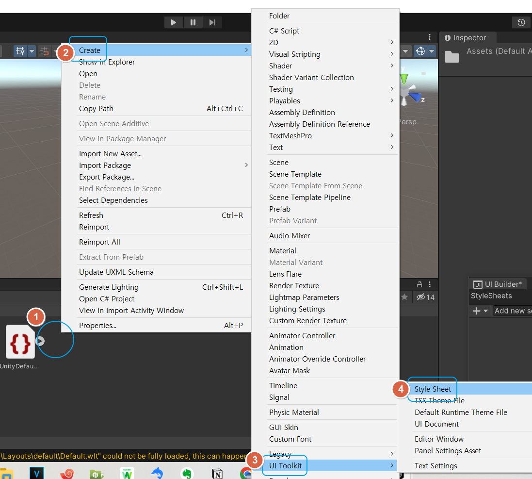 Asset 폴더를 선택, 빈 공간을 마우스 우클릭 - Create - UI Toolkit - Style Sheet 를 선택하고,