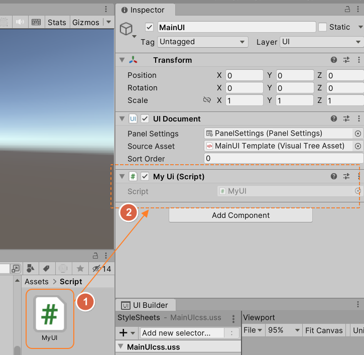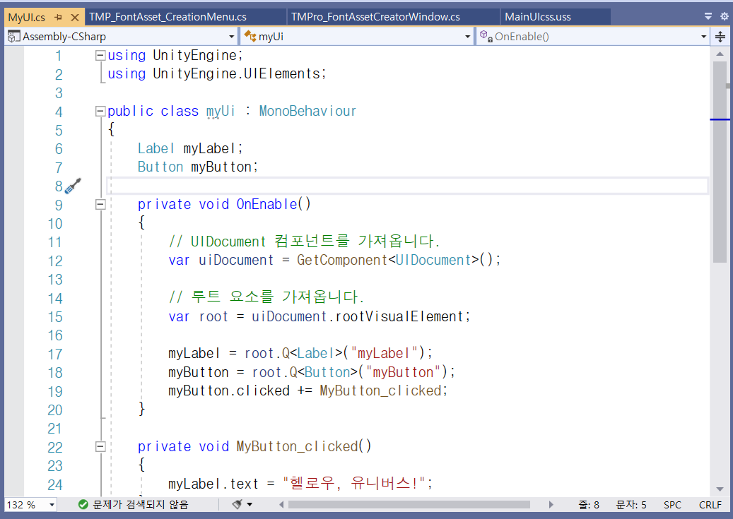 이제 C# 스크립트를 생성해야 하니, Ctrl+S 키로 저장하고, UI Builder 창을 닫거나 한쪽에 접어 주세요.
