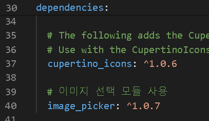 1. pubspec.yaml 파일에 image_picker 외부 위젯를 추가합니다.