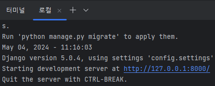 장고 웹서버가 실행되며, URL이 뜹니다. 보통은 http://127.0.0.1:8000/ 인데요
