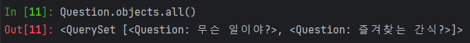 q.choice_set.all() 명령으로 추가한 설문 항목을 확인할 수 있습니다.