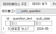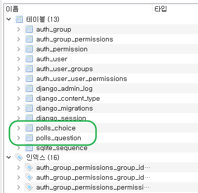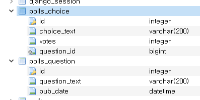 여러개의 테이블이 뜨는데 그 중 polls_question, polls_choice 테이블을 찾아보실 수 있습니다.