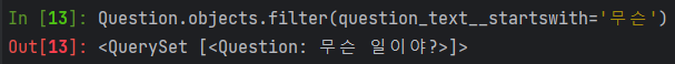 아래 명령을 입력하면, question_text 항목이 '무슨'으로 시작하는 문장의 데이터를 검색해 보여줍니다.