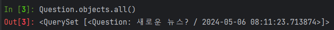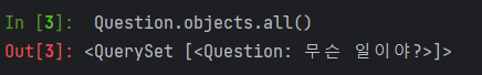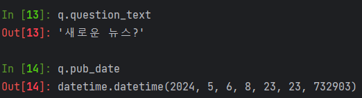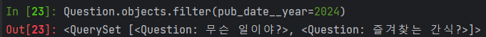 <QuerySet [{'id': 4, 'question_text': '무슨 일이야?', 'pub_date': datetime.datetime(2024, 5, 6, 8, 23, 23, 732903)}, {'id'