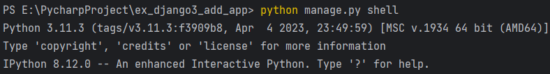 터미널에서 아래 명령을 입력하면 장고용 인터프리터로 진입합니다.