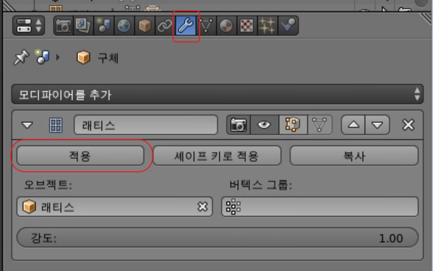그 다음 모디파이어 탭에서 레티스 모디파이어를 적용시키면 모양이 고정됩니다.