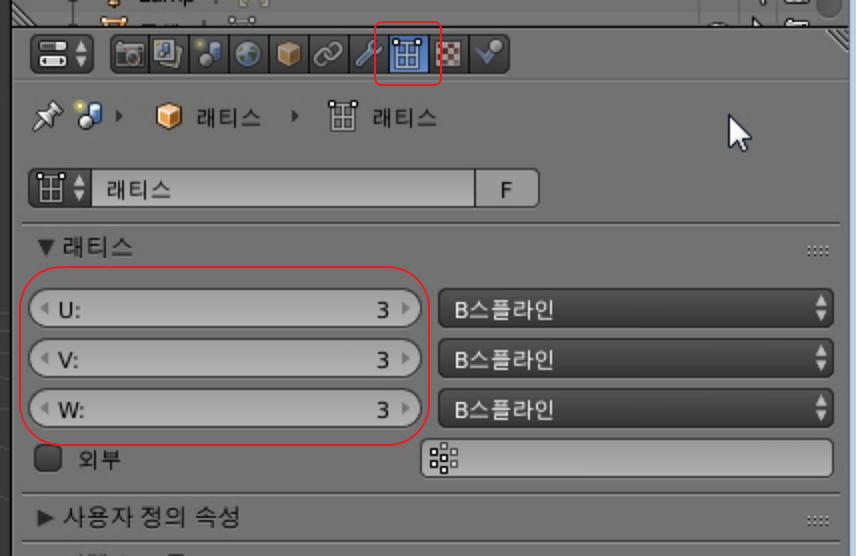 이제 래티스를 선택하고 오른쪽 래티스 속성 창에서 U, V, W 를 모두 3으로 변경합니다.