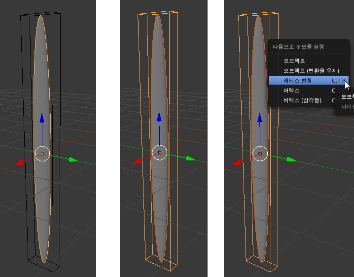 구 선택, shift 키 누르고 래티스(상자) 선택, Ctrl+P , 래티스 변형 선택
