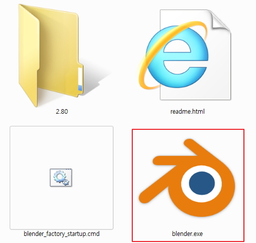 블렌더 캔디데이트 3 버전은 설치용이 아니라 그냥 압축을 푼 폴더에서 바로 실행하도록 되어 있습니다. 폴더 안에 들어가면 파일이 엄청 많을텐데요. 아래와 같은 blender.exe 아이콘을 찾아 더블클릭합니다. (.exe 는 보통 보이지 않는 경우가 많으니 보이지 않을 경우라도 착오 없으시기 바랍니다 )