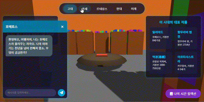 일반적인 도서관 시스템과는 달리, 이 프로젝트는 사용자가 역사적 시간대를 여행하며 그 시대의 문학, 기술, 사상을 경험할 수 있는 상호작용형 웹 환경을 만드는 것입니다.
