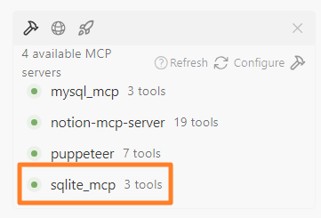 그리고 나서 스크롤바를 약간 내리면 MCP 도구 목록이 보일텐데요. sqlite_mcp 3 tools 가 뜨면 제대로 연결된 것입니다.