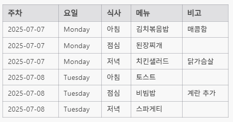 주간식단 테이블 만들고 대충 데이터를 넣어줘.