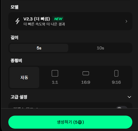 그리고 모델은 'V2.3(더 빠름)' 기본값으로 해야 5크레딧이 차감됩니다.