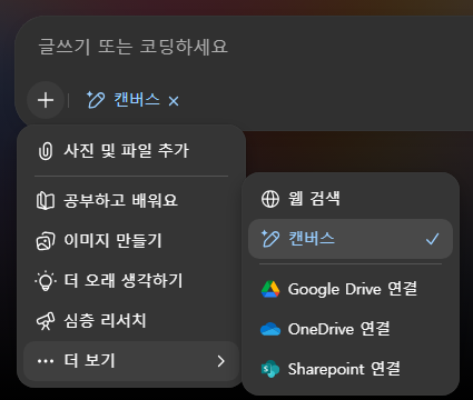 먼저 + 버튼을 누르고 더 보기 - 캔버스를 선택합니다.