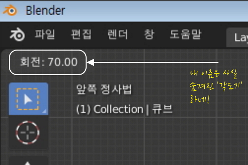 물체의 회전량은 화면 좌측 상단에 각도기처럼 표시되기 때문에