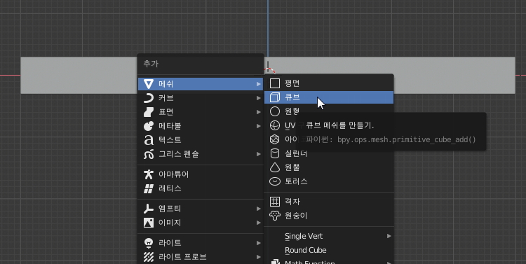 Shift + A키를 누르면 지금 있는 오브젝트 외에 추가로 새로운 오브젝트를 생성할 수 있습니다. 메쉬 - 큐브를 선택하시면,