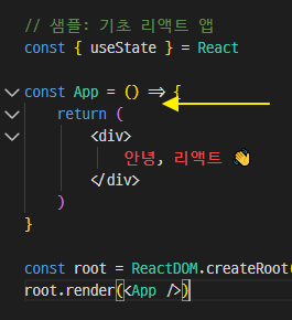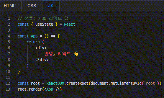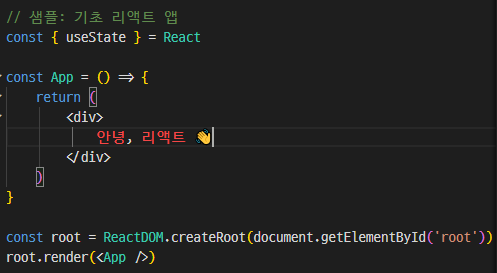 웹 브라우저 화면에 "안녕, 리액트 👋"를 표시해주는 간단한 소스입니다.