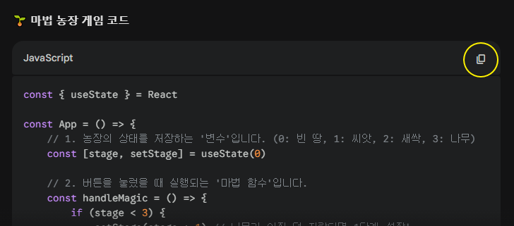 AI가 만들어준 코드 박스 우측 상단의 '복사' 버튼을 누르시고,