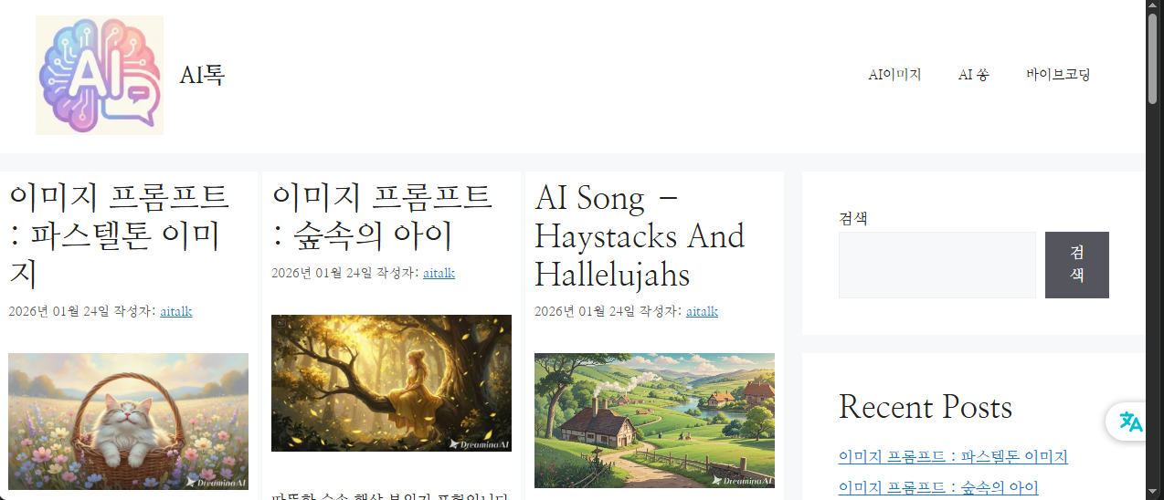 이번에 개설한 'ai톡' 워드 프레스는 AI활용 사례에 대해 카카오톡으로 메시지 보내듯 간단히 메모하는 형태로 사용할 예정입니다. 정리되지 않은 글은 이쪽에 쓰고 정리해서 티스토리 블로그로 옮길지도 모르겠네요 ㅎㅎ