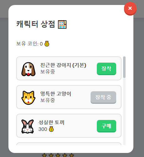 획득한 골드로는 캐릭터 상점에서 캐릭터를 구매할 수 있습니다.