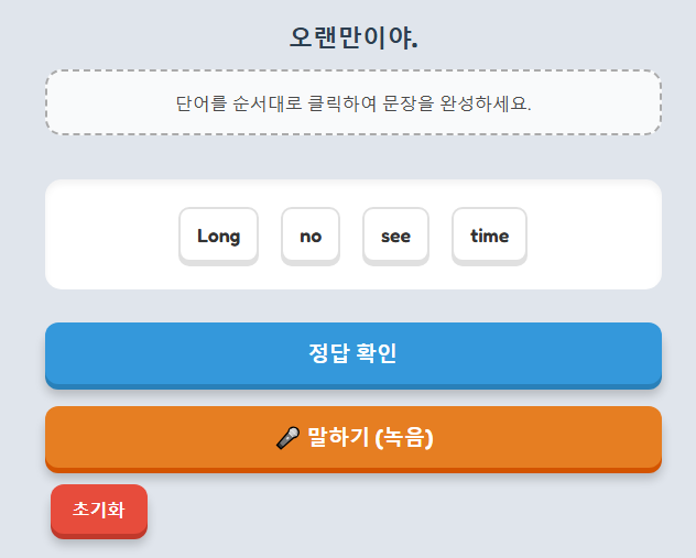 영어듣기 또는 한글 뜻이 하나 주어지면 단어를 차례대로 선택해 배열을 맞추거나