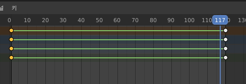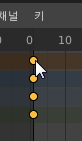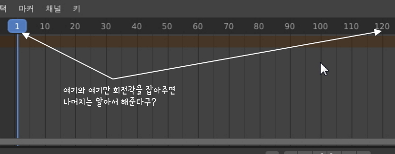 이 그림의 의미를 해석하면, 노란 점은 1번 프레임과 120번 프레임에 키를 잡아준 흔적인데 중간 지점의 움직임은 자동으로 잡아줍니다.