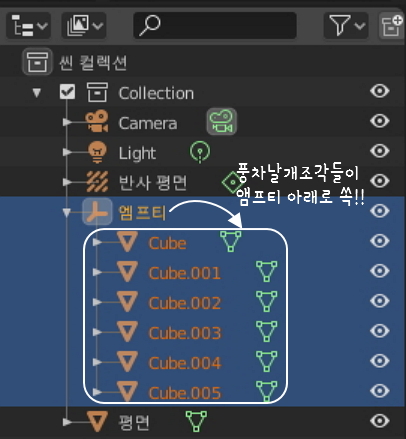 바로 풍차날개 6조각들이 모두 앰프티 오브젝트의 하위로