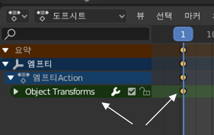 3D뷰포트 창 말고도 왼쪽에 미리보기 창, 아래쪽이 도프시트라고 해서 애니메이션을 제어하는 창입니다.