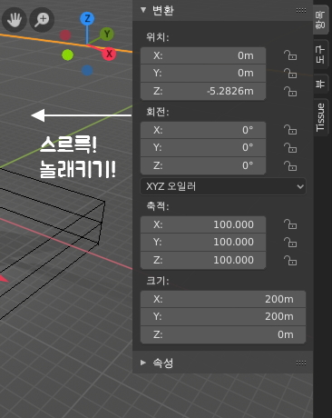 뷰포트에 마우스를 두고 단축키 N 키를 눌러보시면 뭔가가 오른쪽에서 스르륵하고 등장할 겁니다.