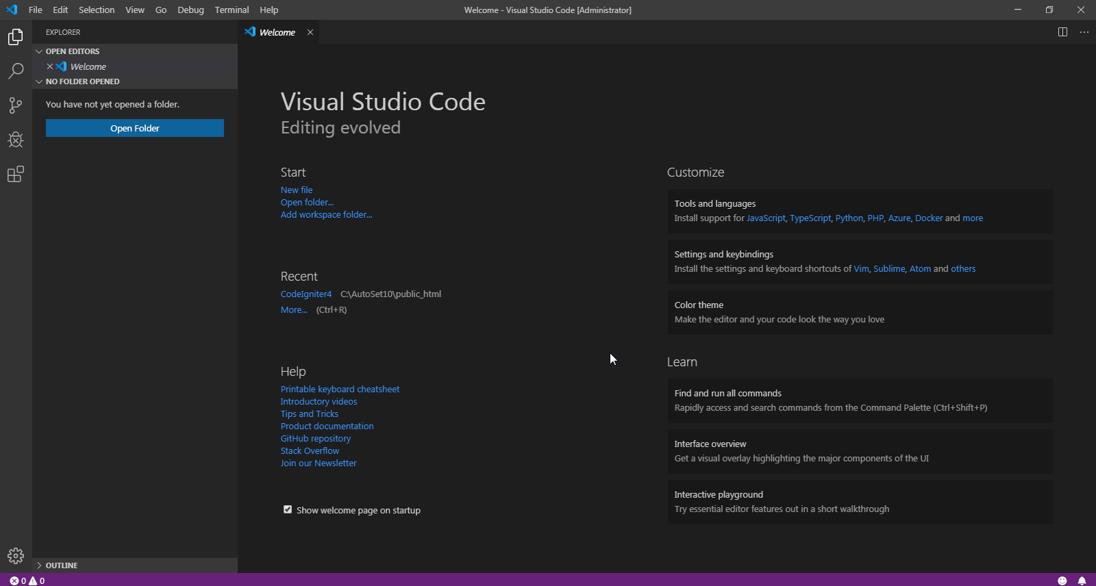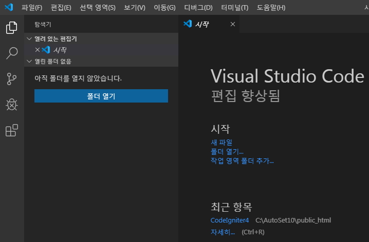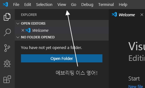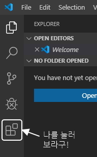 비주얼 스튜디오 코드를 실행하시면 처음에 이런 화면이 나옵니다.
