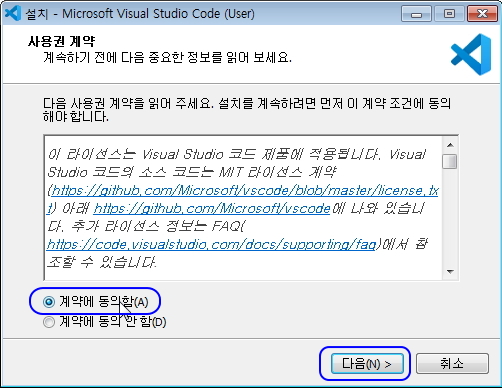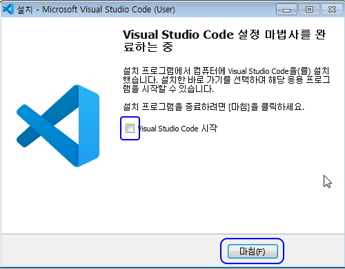 모두 설치가 끝난 다음에 마침 버튼을 누르시기 전에 Visual Studio Code 시작 체크 상자를 일반 풀어주세요.