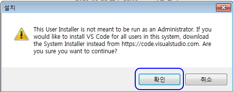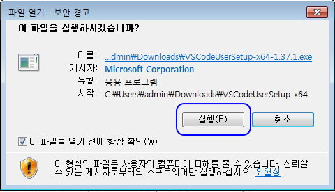 비주얼 스튜디오 코드 프로그램을 다운받은 다음, 실행하시면 대개 프로그램 실행 경고가 나옵니다.