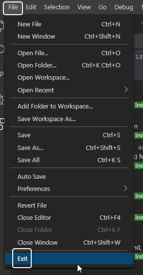 File - Exit 메뉴를 선택하여 비주얼 스튜디오 코드 프로그램을 종료했다가.