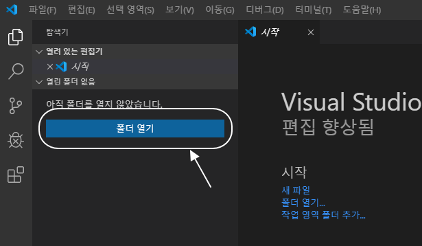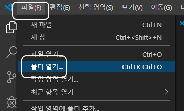 파일 메뉴를 클릭하시면 하위 메뉴에 폴더열기 메뉴가 있습니다.