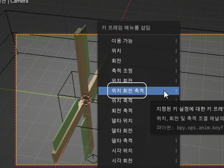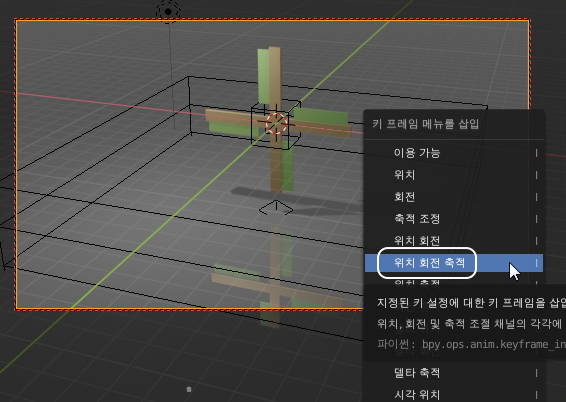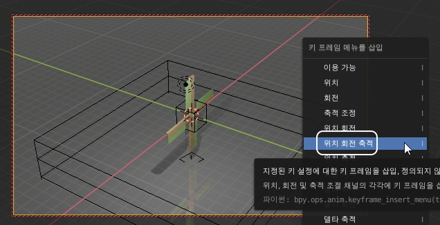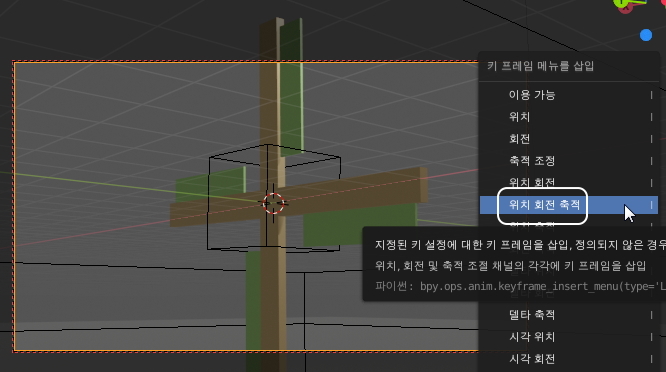 그리고 역시 마우스를 3D뷰포트 위에 놓고 단축키 I 키, 위치 회전 축적을 선택합니다.