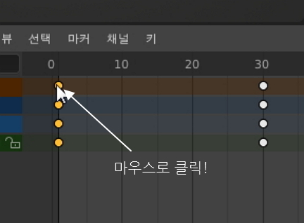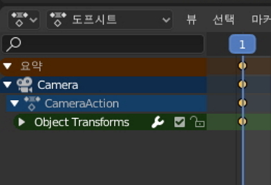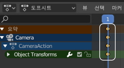 그러면 화면 하단의 도프시트 창에 1번 프레임에 키프레임이 하나 생겨납니다.