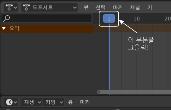 그리고 화면 아래, 도프시트 창에서 1번 프레임 상단을 클릭해서
