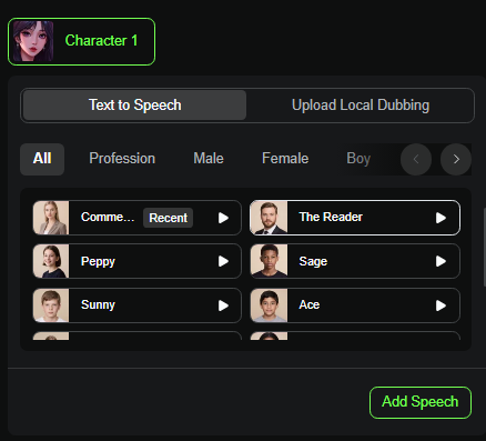 그리고 Add Speech를 눌러 대사가 추가하면 되는데요.