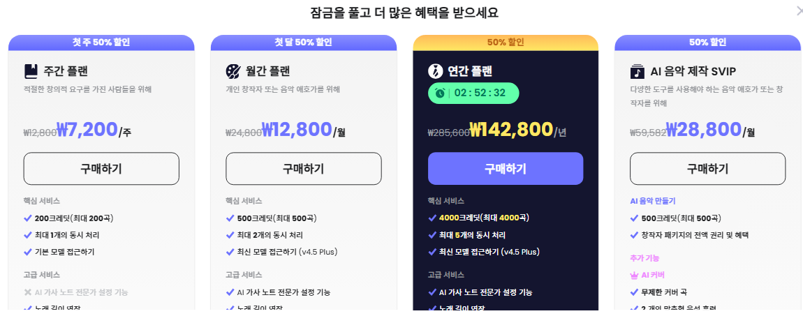 한곡에 1.5 크레딧을 사용하지만 한번에 2곡씩 생성하기 때문에 사실 1번밖에는 체험할 기회가 없습니다.
