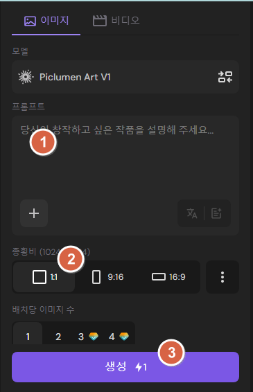 1) 프롬프트 작성, 2) 비율 선택, 3) 생성 순으로 선택하시면 됩니다.