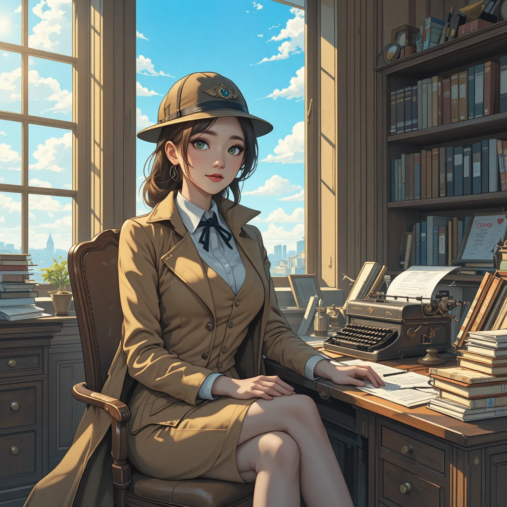 A charismatic female detective sitting in her private office, exuding intelligence and mystery, wearing a stylish suit with vintage accessories. Sunlight pours through the window beside her, revealing a clear blue sky outside. Papers, books, and an old typewriter rest on her desk, evoking the atmosphere of a classic detective story. Cinematic lighting, detailed facial expression, sharp focus, ultra realistic, masterpiece, inspired by Sherlock Holmes aesthetic.